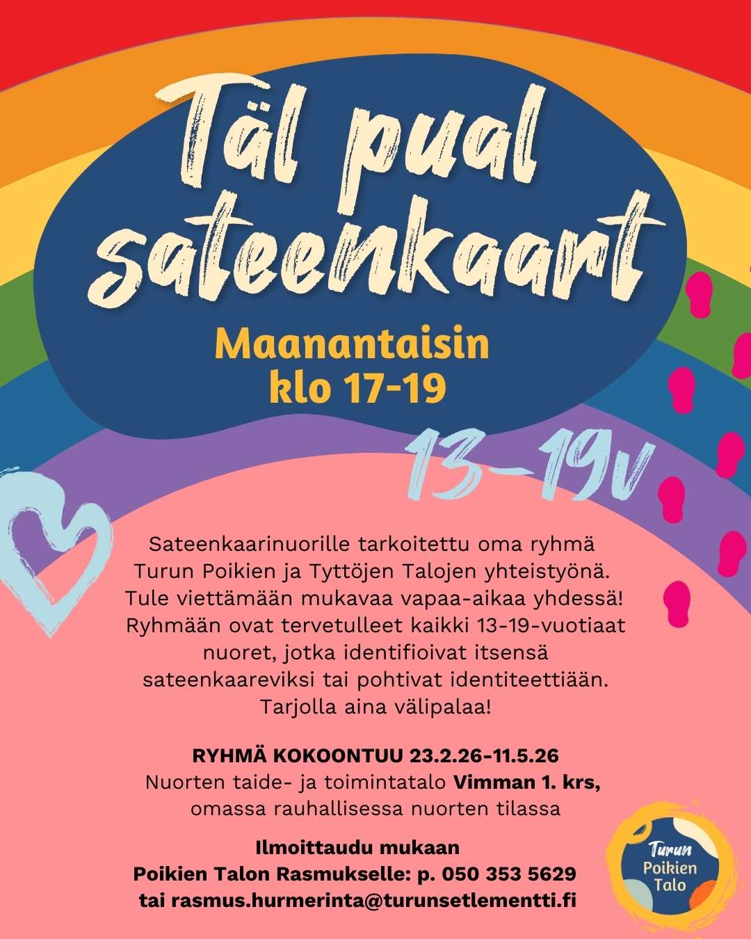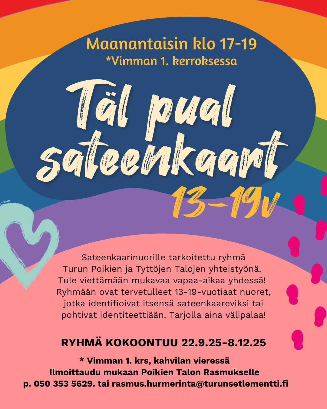 Seksuaali- ja sukupuolivähemmistöihin kuuluville nuorille tarkoitettu ryhmä Tyttöjen ja Poikien Talojen yhteistyönä. Ryhmään ovat tervetulleet kaikki 13-19-vuotiaat nuoret, jotka identifoivat itsensä sateenkaarevaksi tai pohtivat identiteettiään.