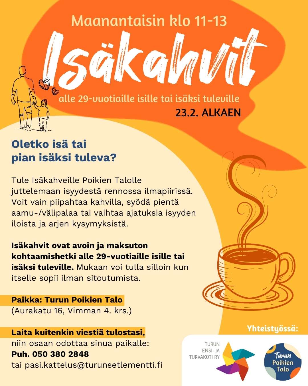 Isäkahvit ovat avoin ja maksuton kohtaamishetki alle 29-vuotiaille isille tai isäksi tuleville. Mukaan voi tulla silloin kun itselle sopii ilman sitoutumista.