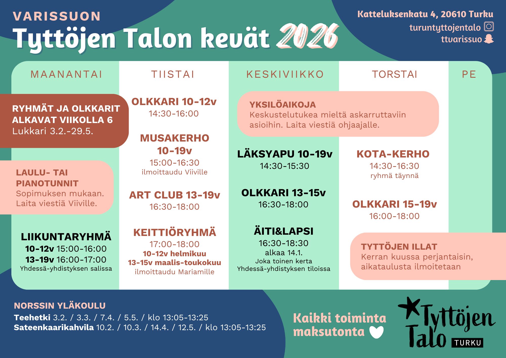 Turun Tyttöjen Talo® Varissuolla tarjoaa maksutonta vapaa-ajan toimintaa ja yksilöllistä tukea 10–19 -vuotiaille tytöille ja nuorille naisille sukupuolen moninaisuus huomioiden.